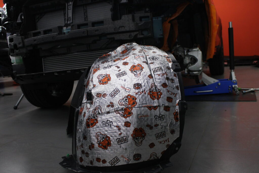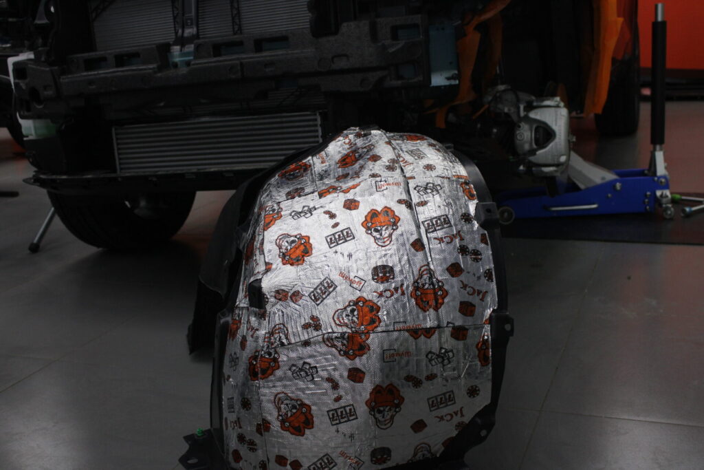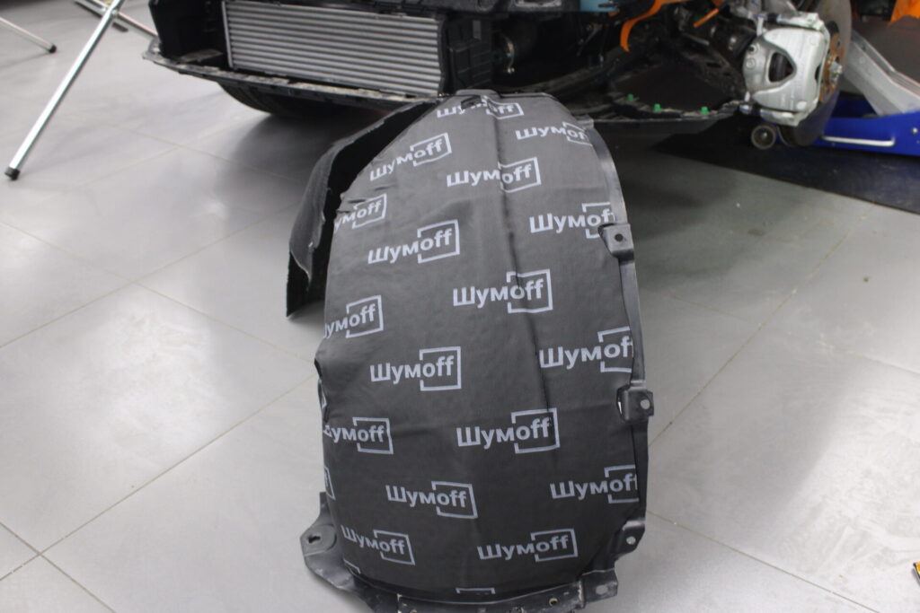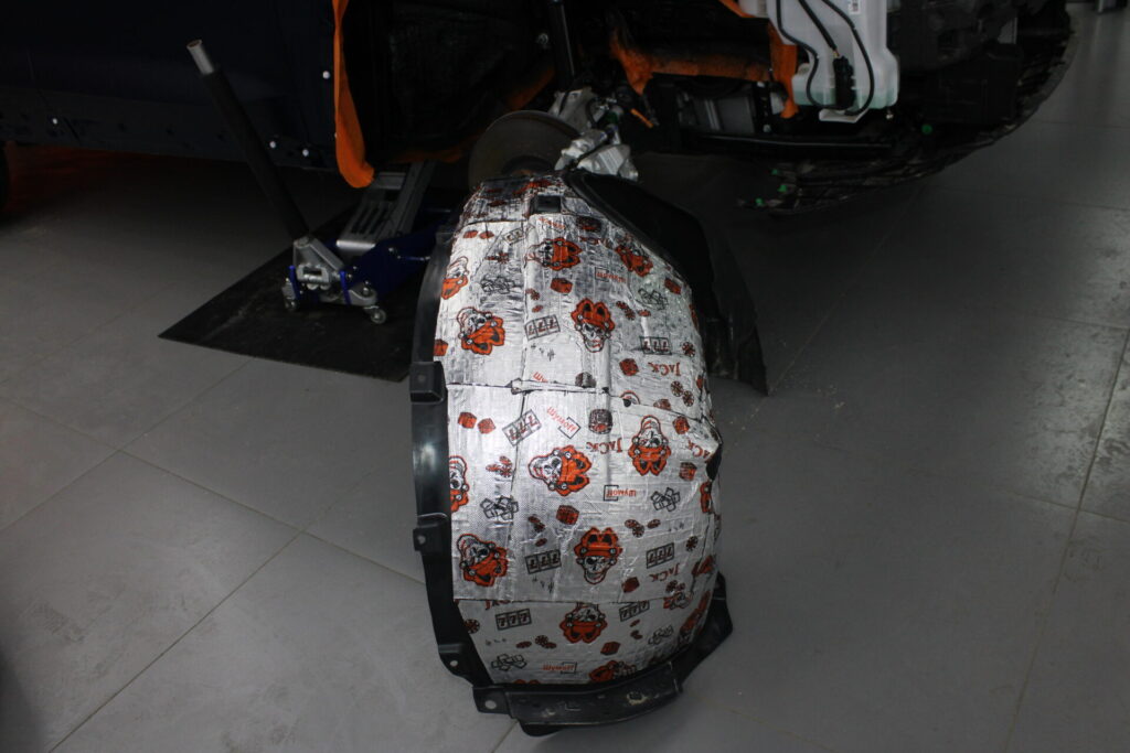 Автомобиль обязательно проходит процедуру химчистку колесного пространства, сушится и только потом обезжириваем и приступаем к монтажу материалов: