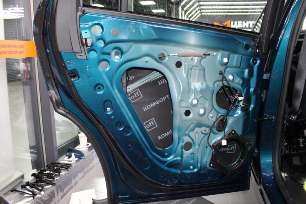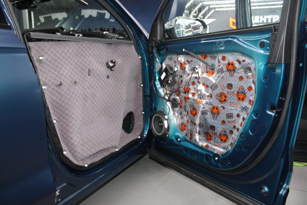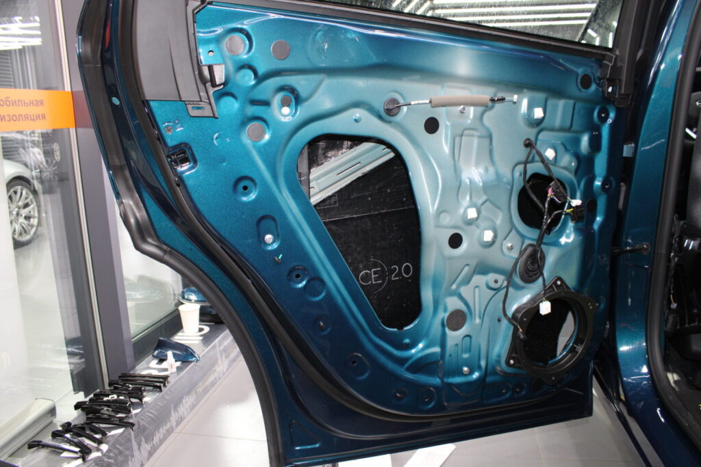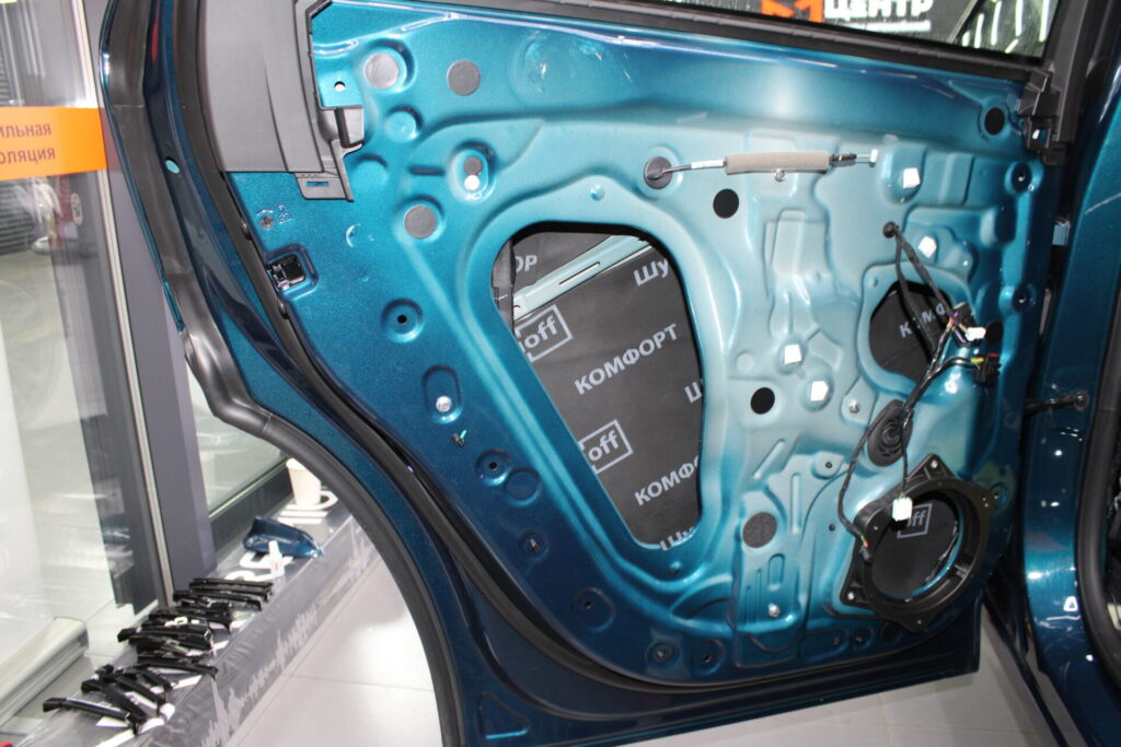 -После шумоизоляции дверей кратно улучшится звучание даже штатной акустики. Это происходит потому, что обрабатывая виброизоляцией металлические поверхности, мы делаем их жестче, а также закрывая внутреннюю стенку с тех. отверстиями вибриозоляцией, мы по сути имитируем закрытый акустический короб.