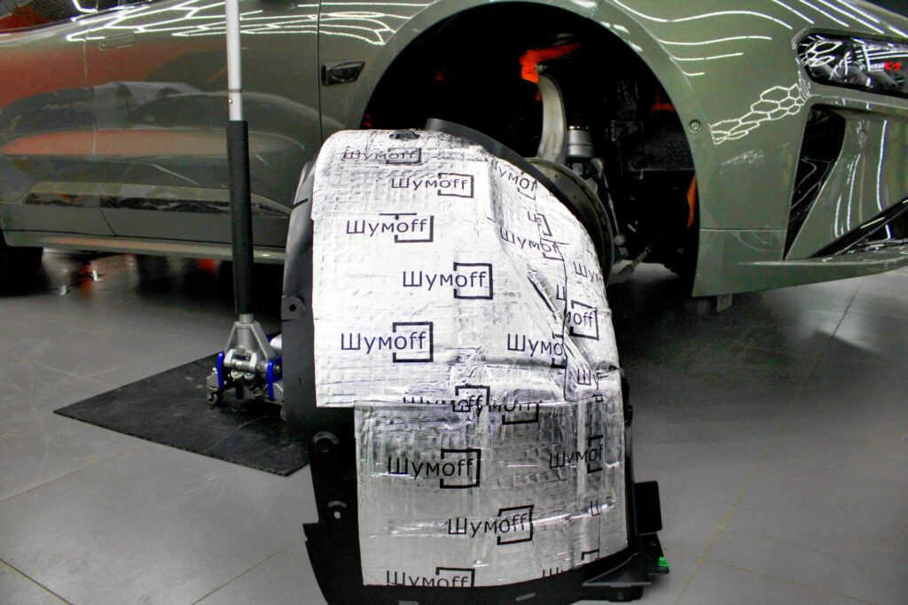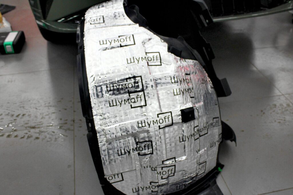 На локеры( подкрылки) наносим первым слоем вибродемпфер Шумофф М2, вторым слоем монтируем вспененную резину Шумофф Комфорт 3. Дополнительно в передние арки устанавливаем заглушку колесной арки, устанавливается между усилителем и крылом( полноценно заполняет пустое пространство между крылом и усилителем)